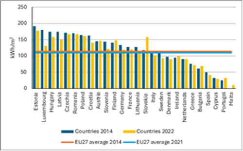 The EU27 average energy consumption per m2 in the household sector was 80 kWh/m2 in 2022 . Compared to 2014 (85 kWh/m2), this indicator had decreased by 3.3 percentage points. The unit consumption of heat decreased in the period 2014-20224 in almost all member states except for Portugal, Slovakia, Estonia, and Bulgaria, where the consumption of energy for space heating per m2 increased by 58.0, 10.4, 2.2, and 2.1 percentage points, respectively, during the observed period (Figure 8).