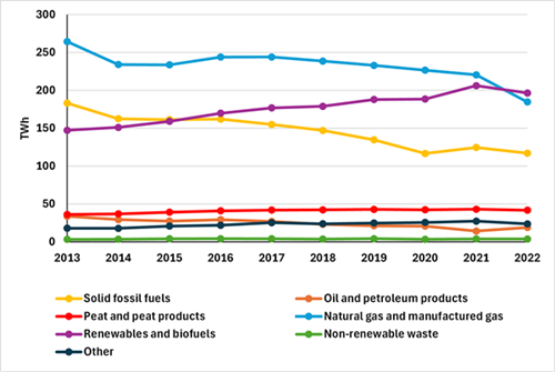 Heat production in the period from 2014 to 2022 has decreased by approximately eight percentage points, including heat production from oil and petroleum products by 36 percentage points, from solid fossil fuels by 28 percentage points, and from natural gas 21 percentage points. At the same time, heat production from waste and other sources, renewable energy sources, and peat has increased (39, 30, and 13 pp, respectively). The detailed data on gross heat production by fuel are presented in (Figure 1).